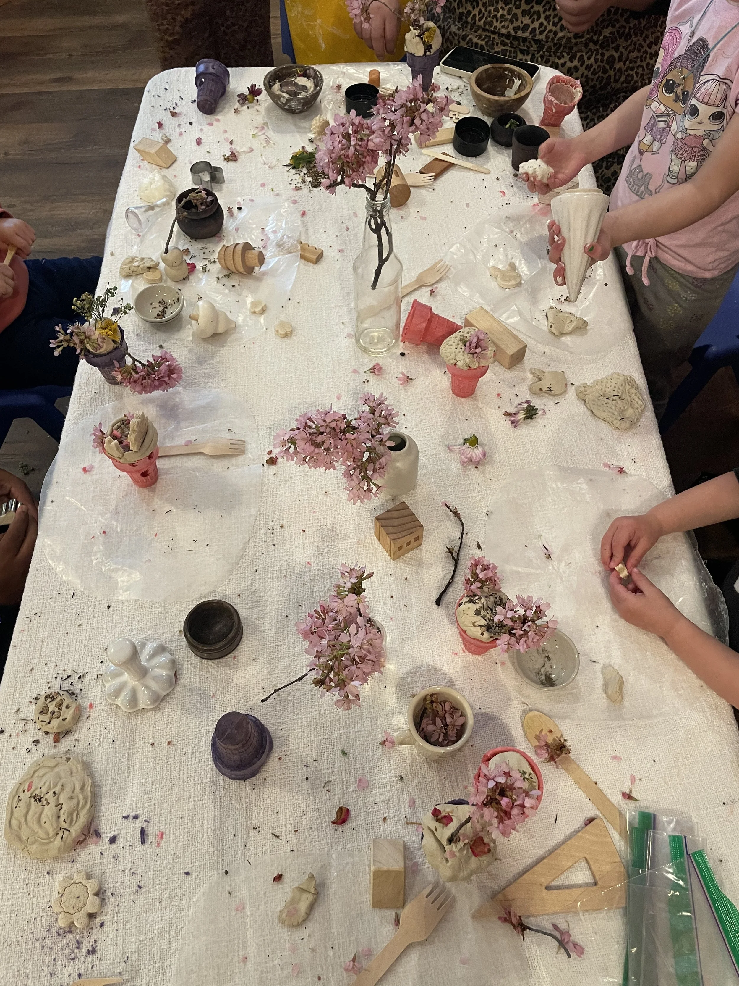 Around the room, I set up a few different stations: painting, a water sensory station, and a building area with salt dough, flowers, and even clementines. The simplicity of the materials really allows the children to lead—and they always come up with more than I could have imagined.